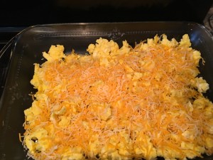Immediately spread shredded cheese on top of the cooked eggs.