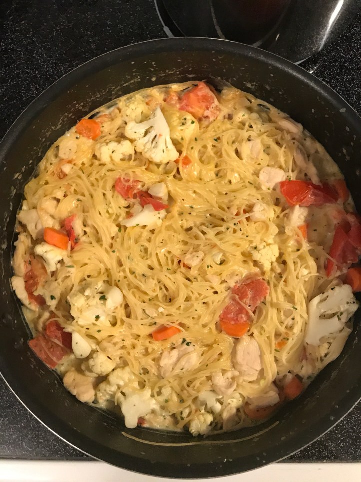 - On another deep pan, cook the package pasta roni according to instruction. Add the veggies after 2 minutes. And the last minute, add the chicken.