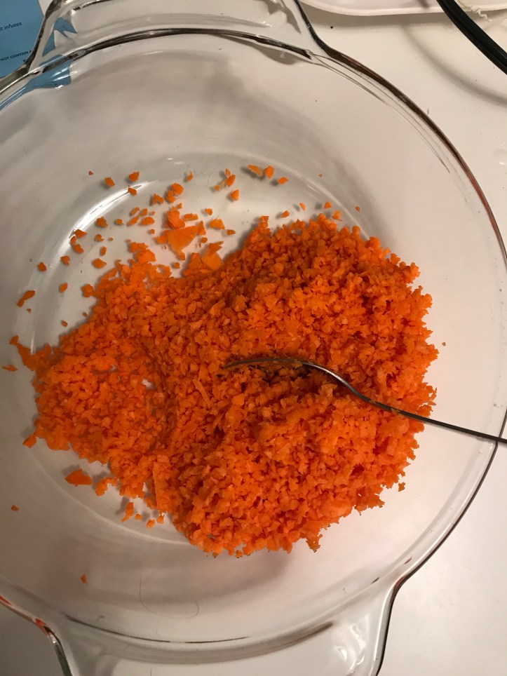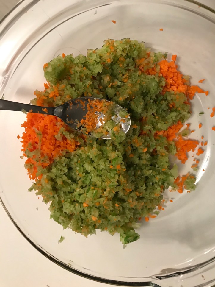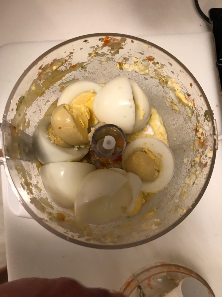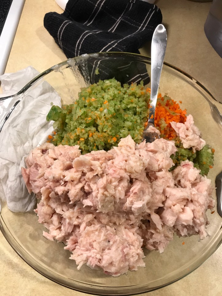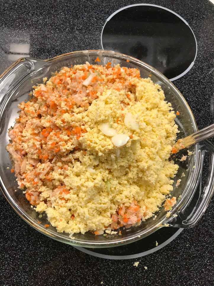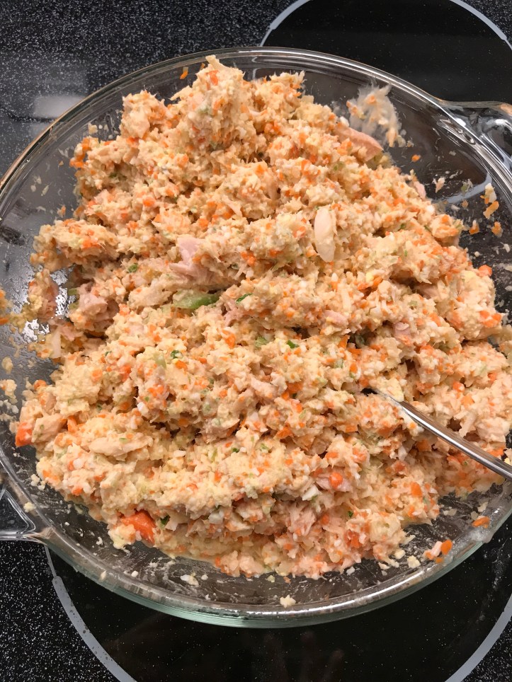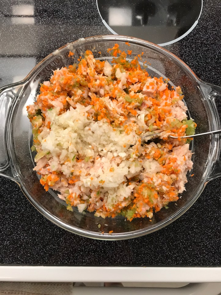 2 stalks of chopped carrots Add 2 to 3 stalks of chopped celeries. Add two 24 ounces of tuna cans Also add 1 small chopped onion Boil eggs until it is cooked inside. About 17 min. Then drain the water and peel the shells off.