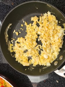 Scramble eggs and add scramble eggs into stir-fried rice at the end of stirred fried rice and stir until evenly distributed.
