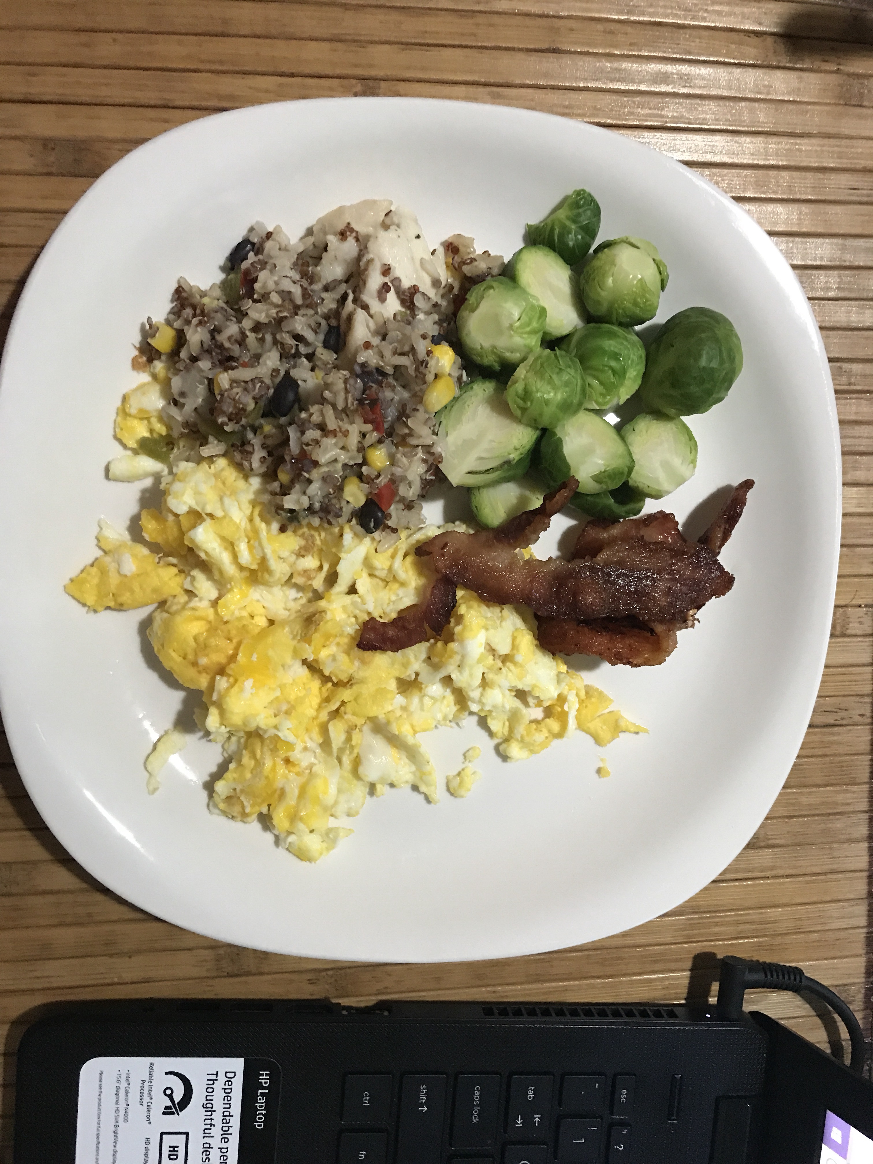 It is nice to add some veggies to your breakfast. Nothing is simpler than steamed veggies. Bacons add some favor to the breakfast; they are not so healthy but a couple of strips occasionally will be okay. Heat up some pre-made frozen fried rice or cooked brown rice to eat with the eggs, bacon strips and steamed veggies and a few pieces of fruits. With such a breakfast, you will feel great to start a new day!