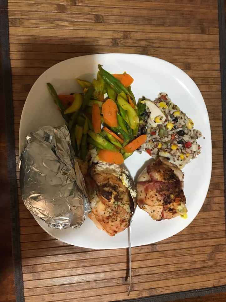 Enjoy the chicken, rice, veggies, and baked Patato. Very tasty!