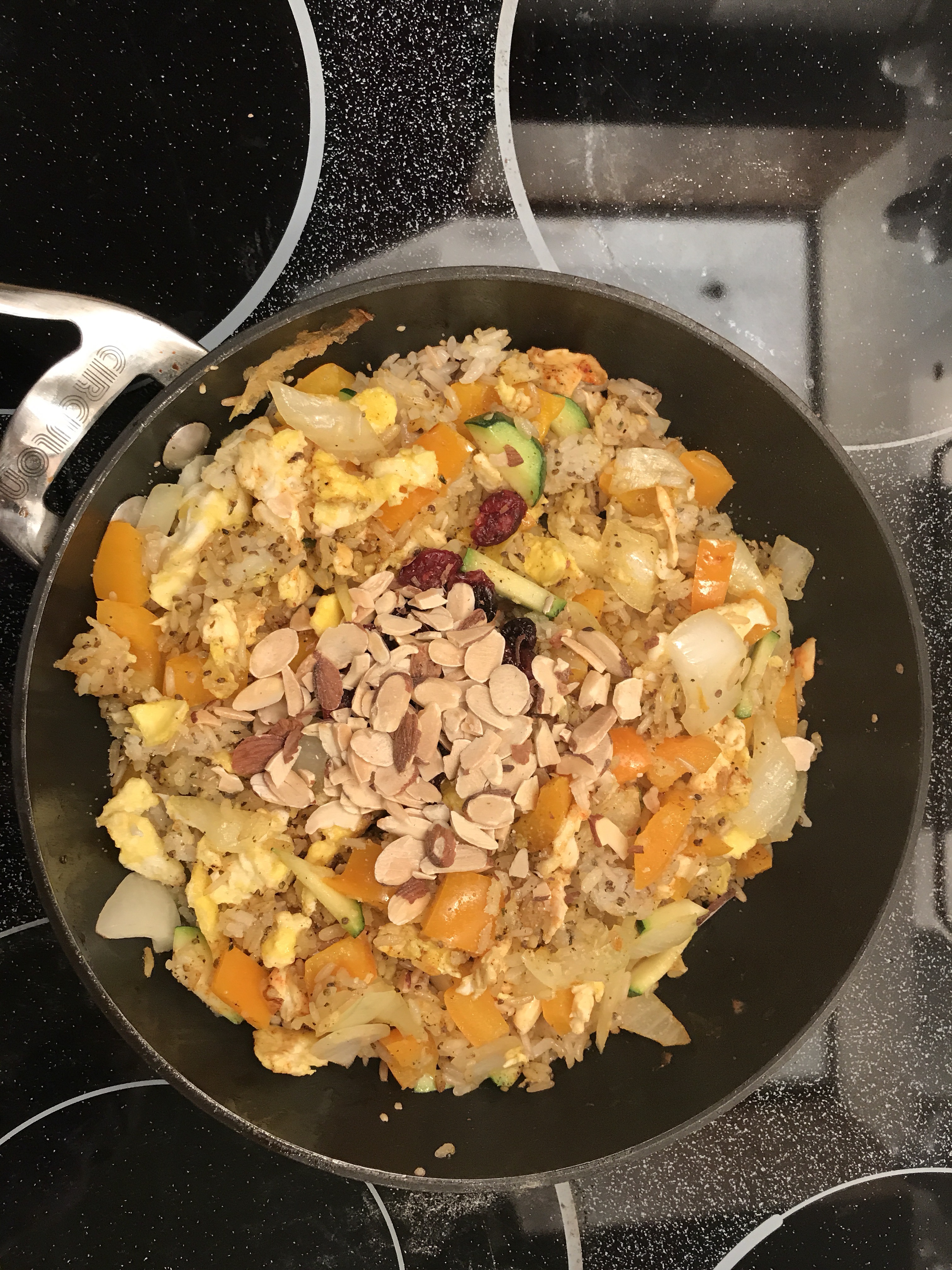 - After stirring for about three min. when veggies are almost done (avoid overcooking it), add the rice and keep stirring them until they look similar to the photo above.