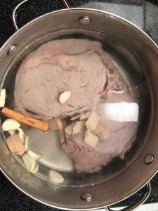 Add garlic, ginger, a cinnamon stick and beef to a fresh pot of water. When it is boil, simmer it for 1 1/2 to 2 hrs.