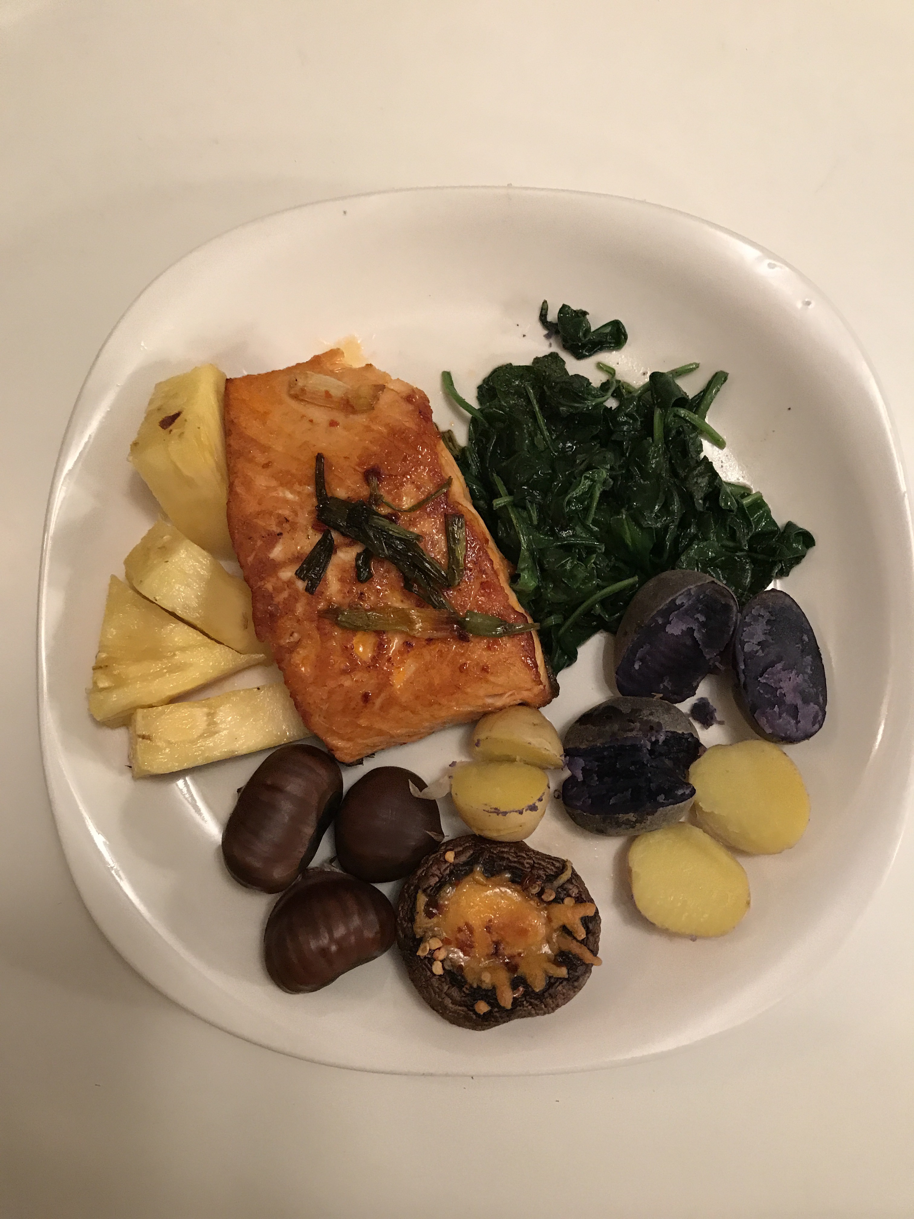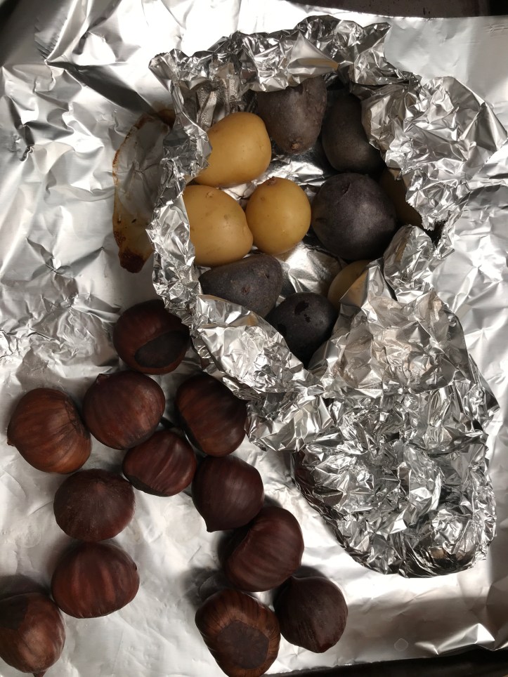 I love baked chestnuts and the small potatoes in different yellow, purple, and red colors. I feel healthy after eating this tasty meal!