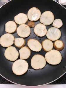 Place potato scallop on the pan and drizzle a bit of oil before turning it over. (Turn it over after it turn slightly brown)