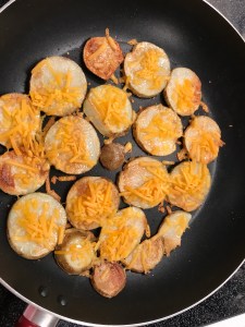 After slightly browning both sides, put some shredded cheese on top.