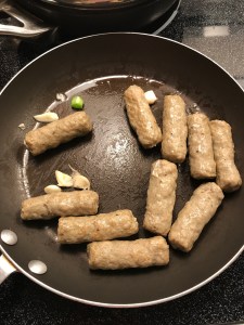 Brown the boiled and cooked chicken sausage on all sides.