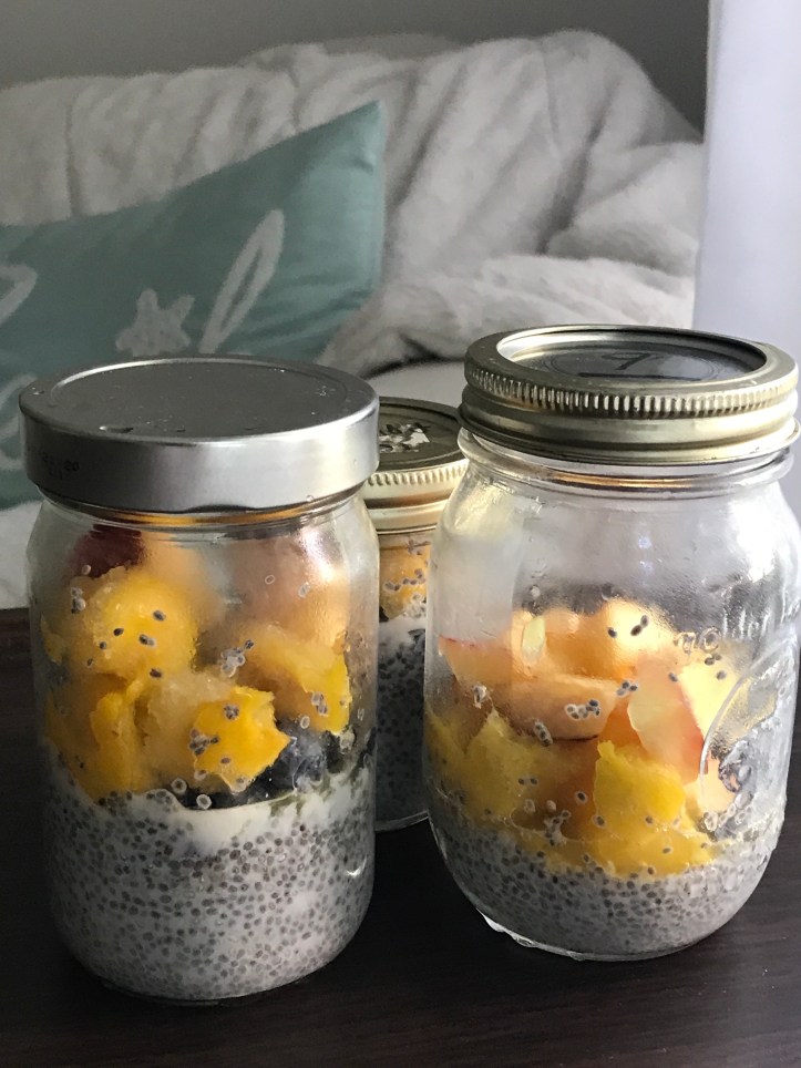 In each small glass container, mix 2 tbspn of chia seeds into 1/2 cup nutmilk and cover it with a lid. Let it sit at least 15 min. or until the mixture has thickened.