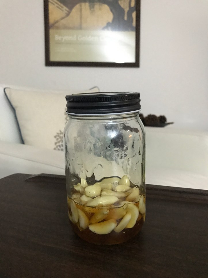 I got the idea from some of Youtube videos to mix garlic cloves with honey. Here is what I have made tonight: