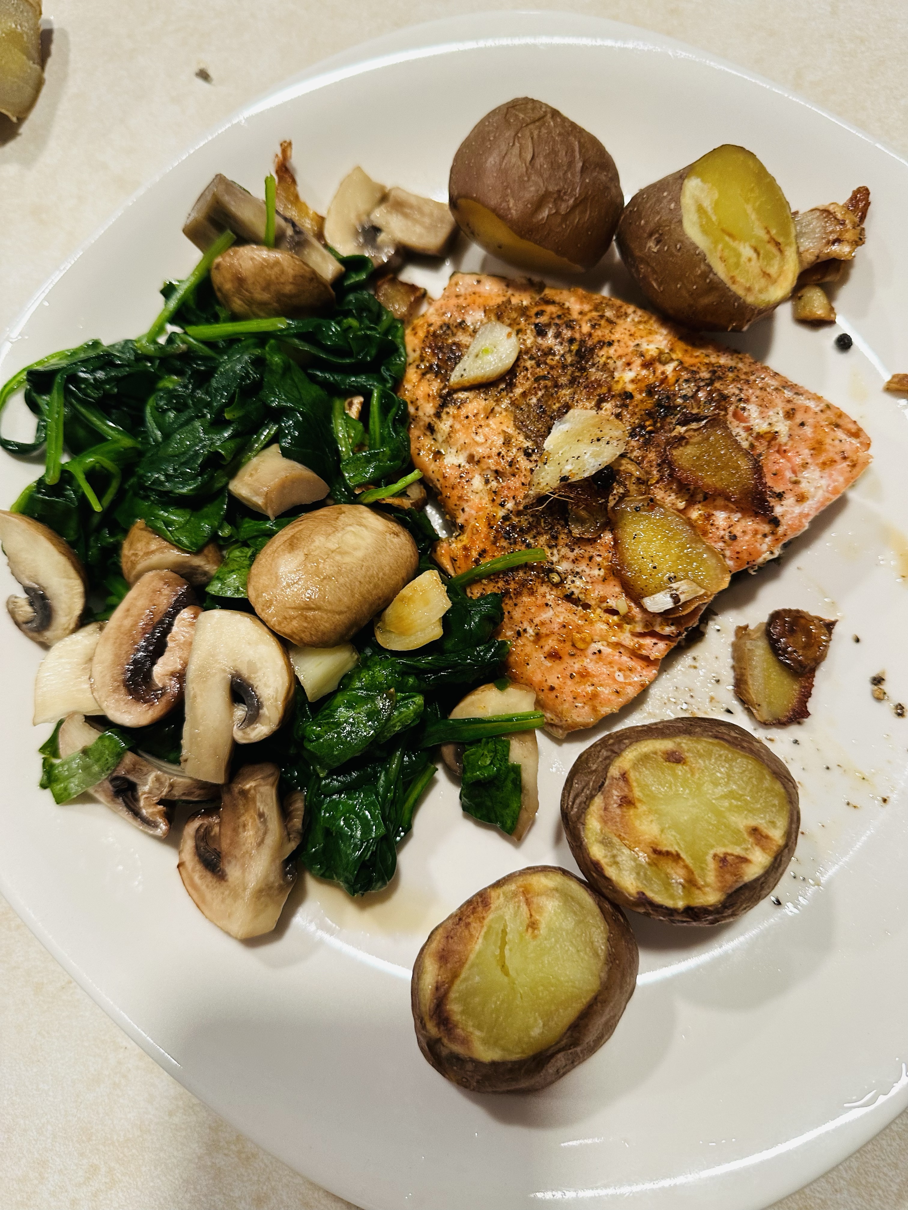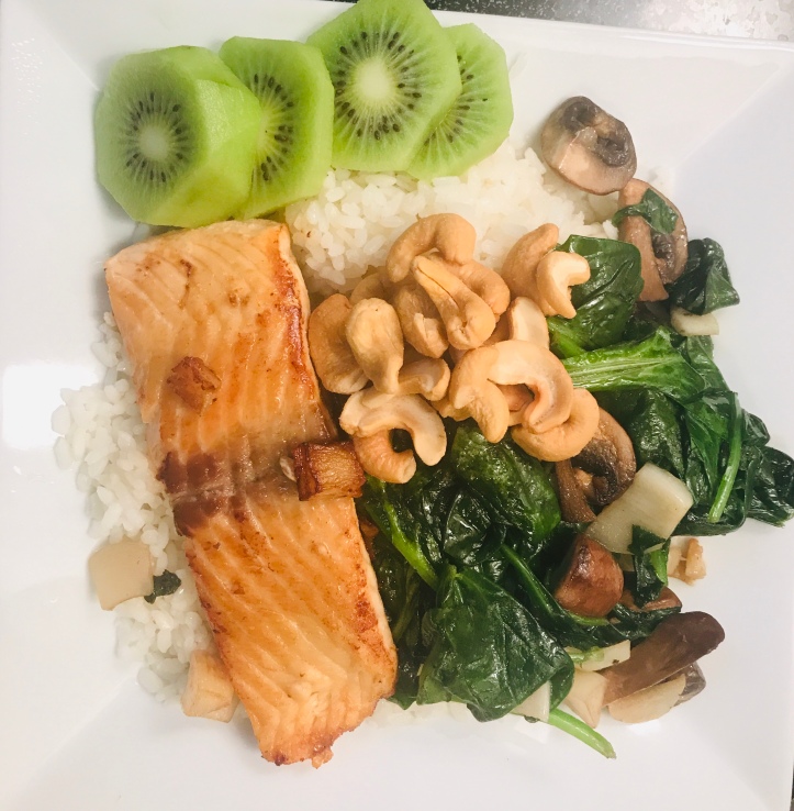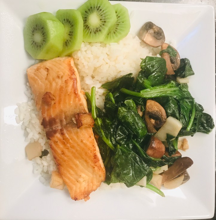 Serve salmon and the spinach and mushrooms over the cooked rice or eat these dishes together with a baked potato. Don’t forget to add a piece of fruit to your plate to increase a healthy fruit intake into your diet.