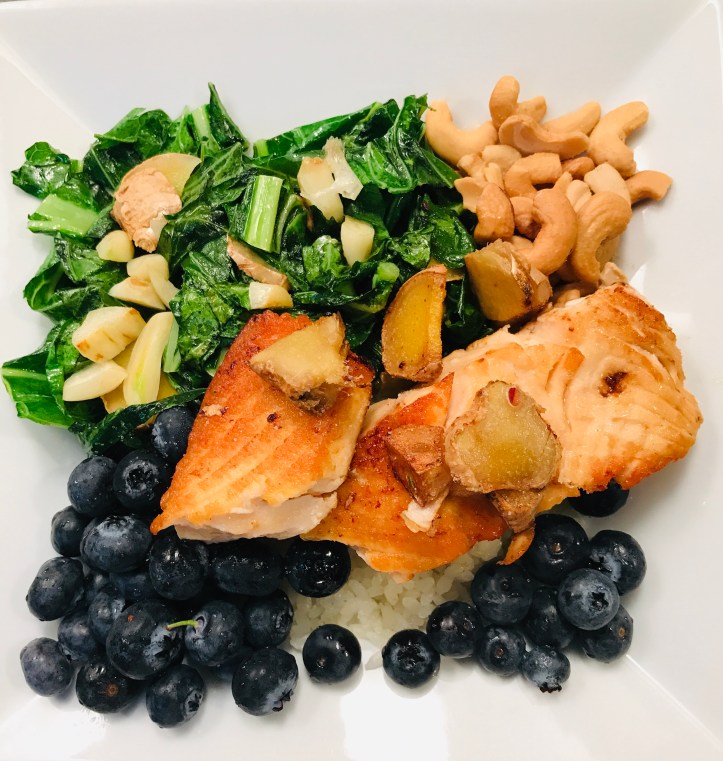 - Garlic–six cloves (3 for veggies and 3 for salmon). Chopped.