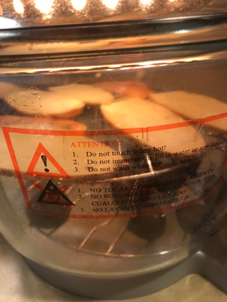 Flip the sweet potato slices to the other side, and spray them with Pam or drizzle some olive oil over them. Bake the slices until they are done (for another 7 to 10 minutes. But after baking the hazelnuts for 15 minutes, take them out.