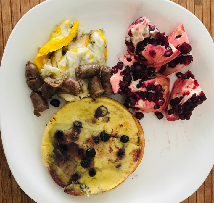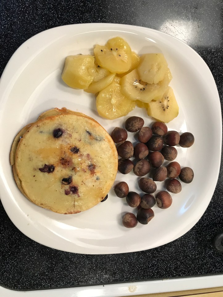 For this breakfast, I ate the pancake with baked hazelnuts, small purple potatoes, and kiwi.