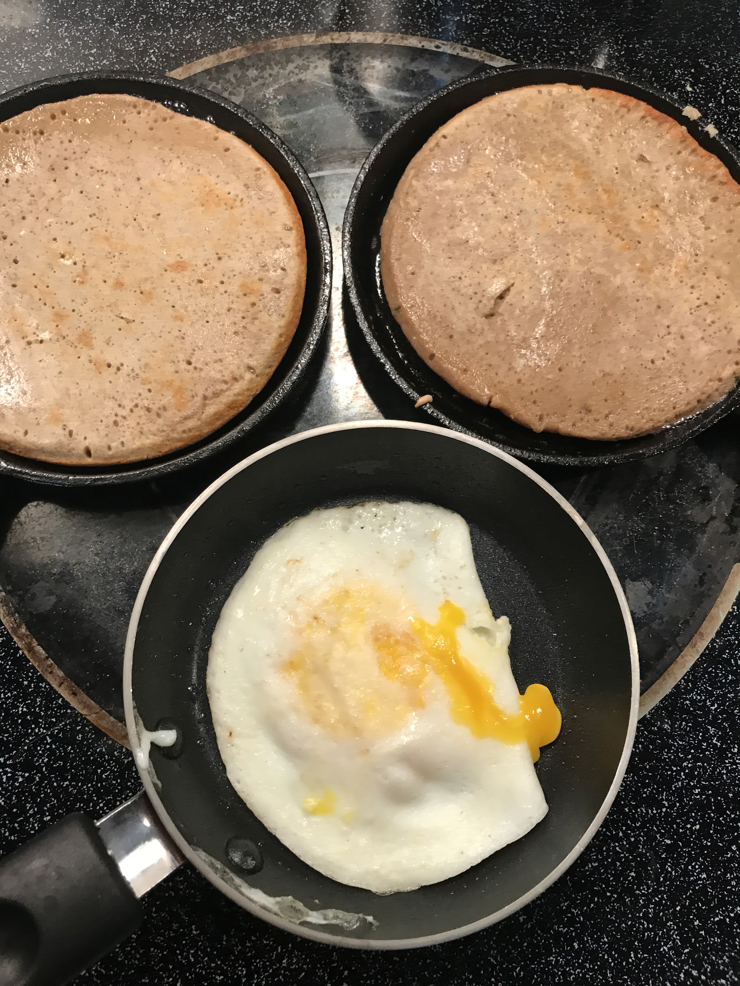 - Additional oil or butter for greasing two mini 5-inch mini cast skillets) for pancakes and one small skillet for cooking egg(s)