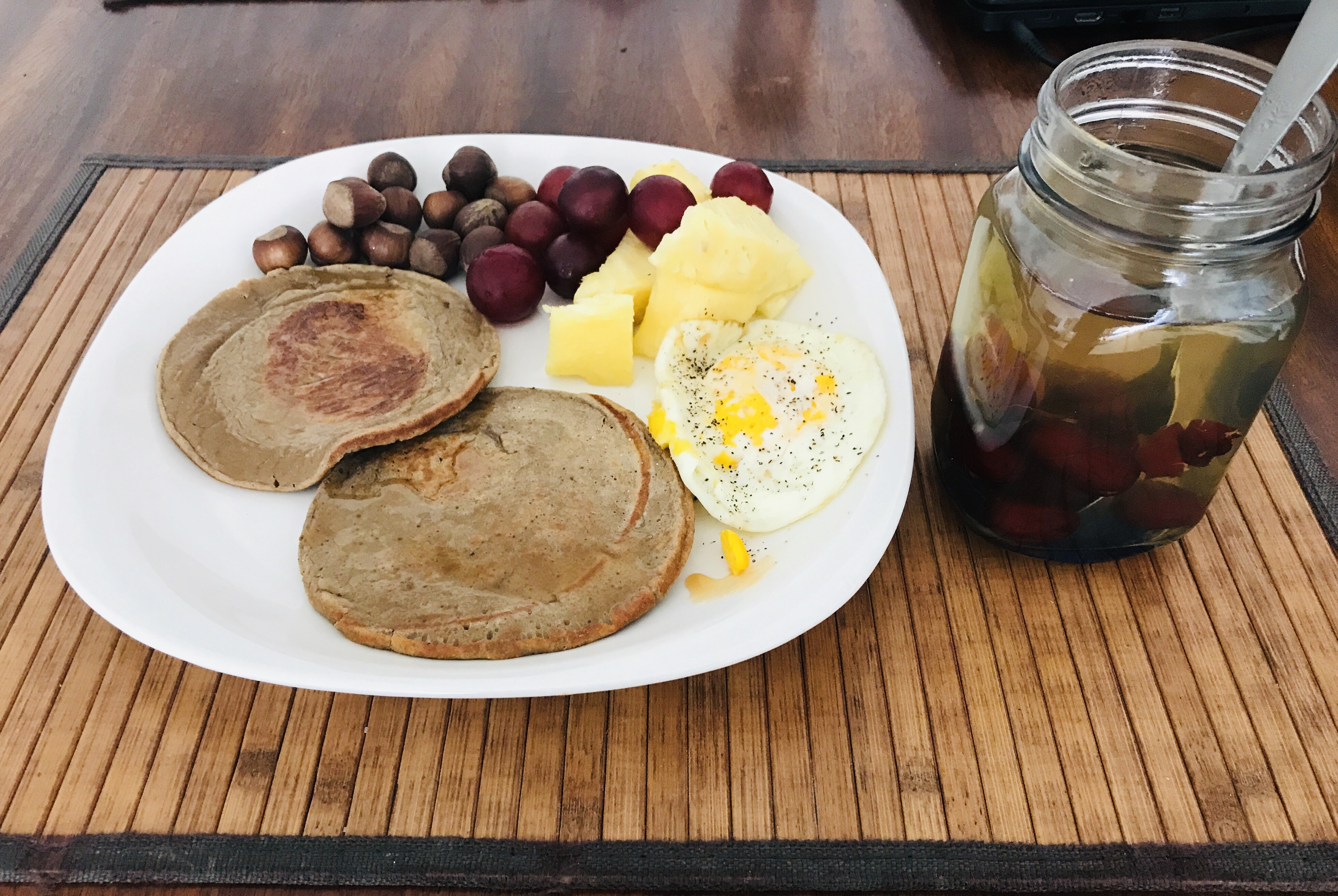 I added honey on these pancakes and ate them with one pan-fried egg, baked hazelnuts and mixed fruits, and also with a cup of hot red date drink.