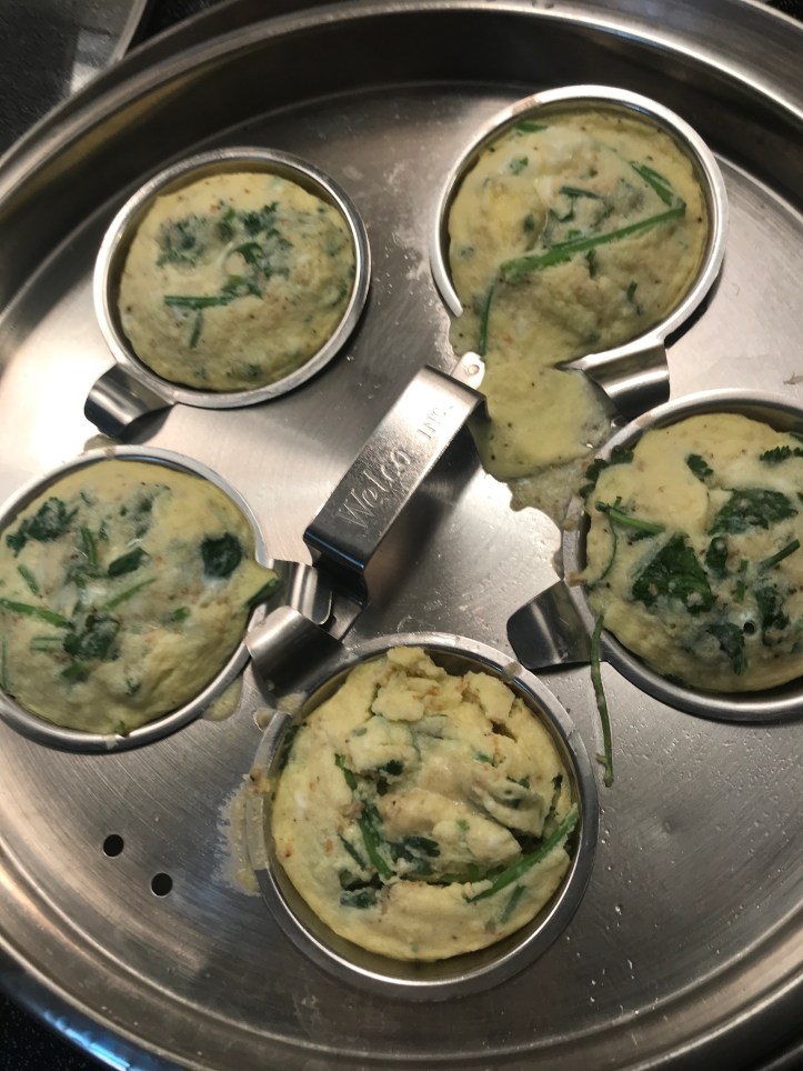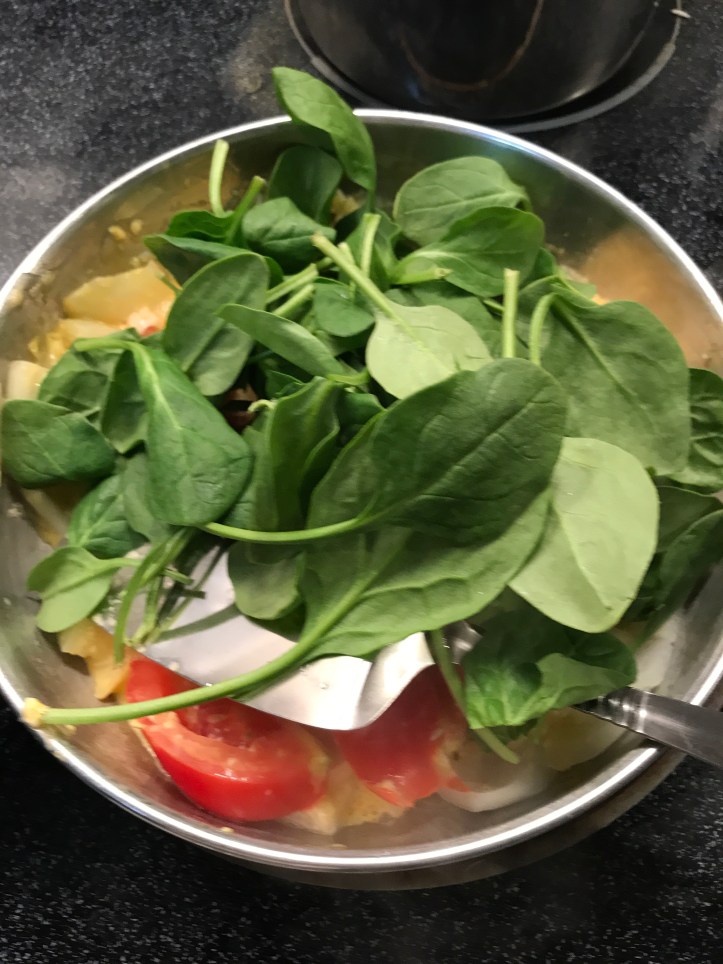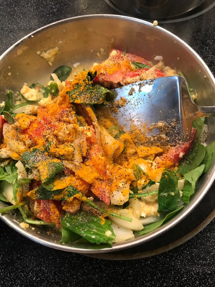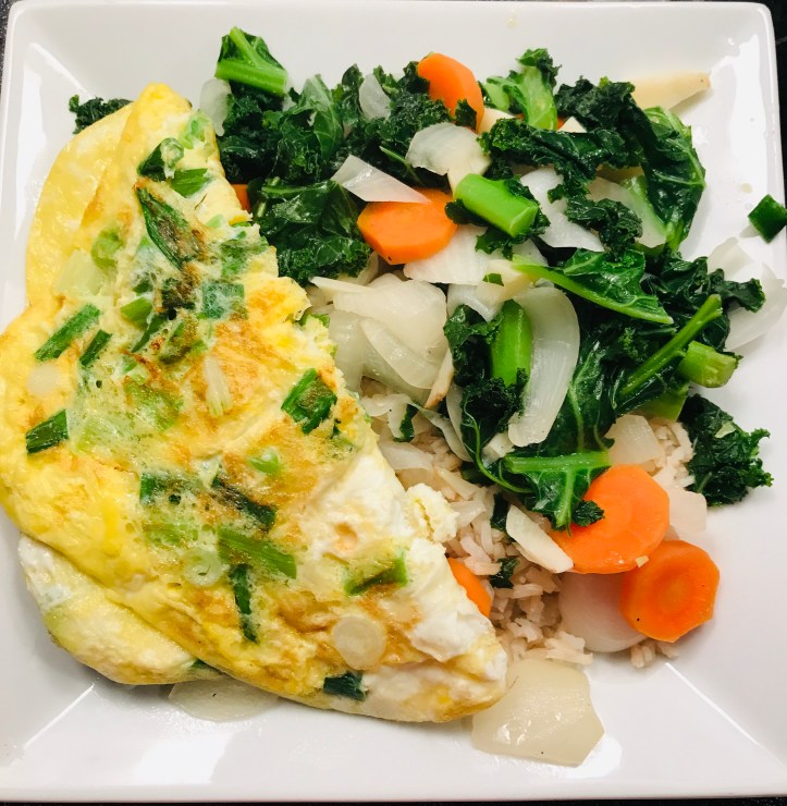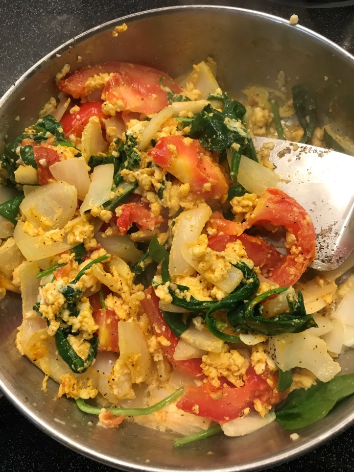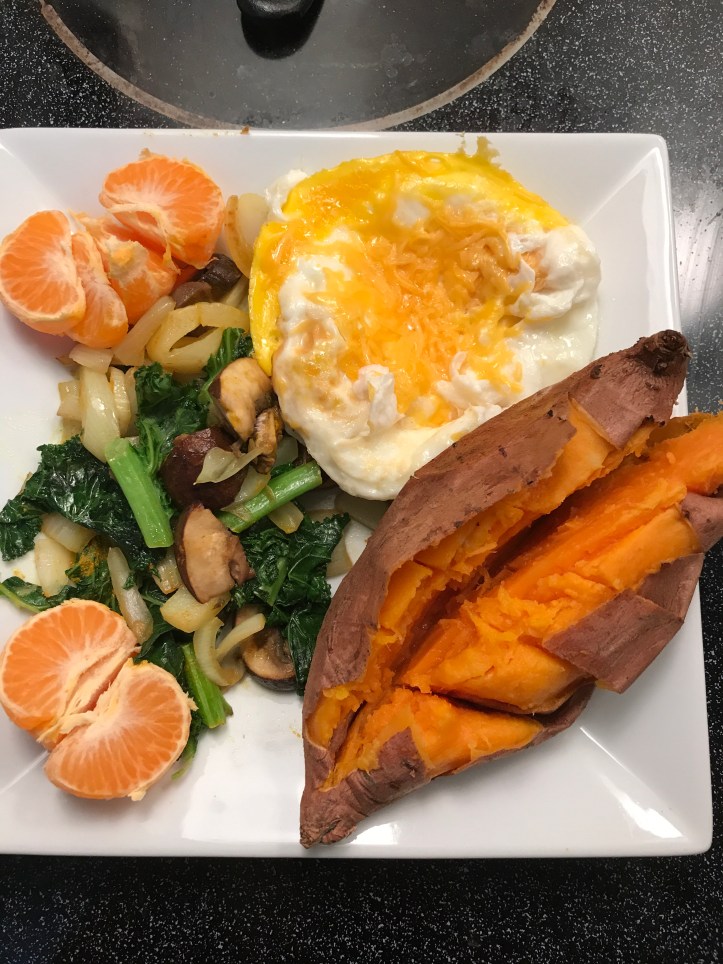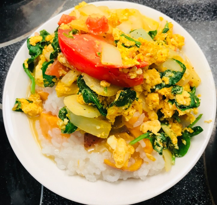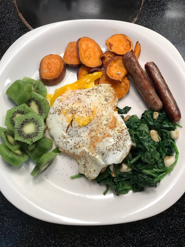 Just slice the sweet potatoes and pan fry both sides of (sweet) potatoes with oil. No need for adding any salt for eggs and no need for any seasoning for sweet potatoes. I did add a bit of salt and pepper on the spinach. I also sprinkle pepper on the eggs. To prepare for vegetable dish, just stir fry vegetables with oil and chopped garlic. Anyone can prepare a simple meal like this.