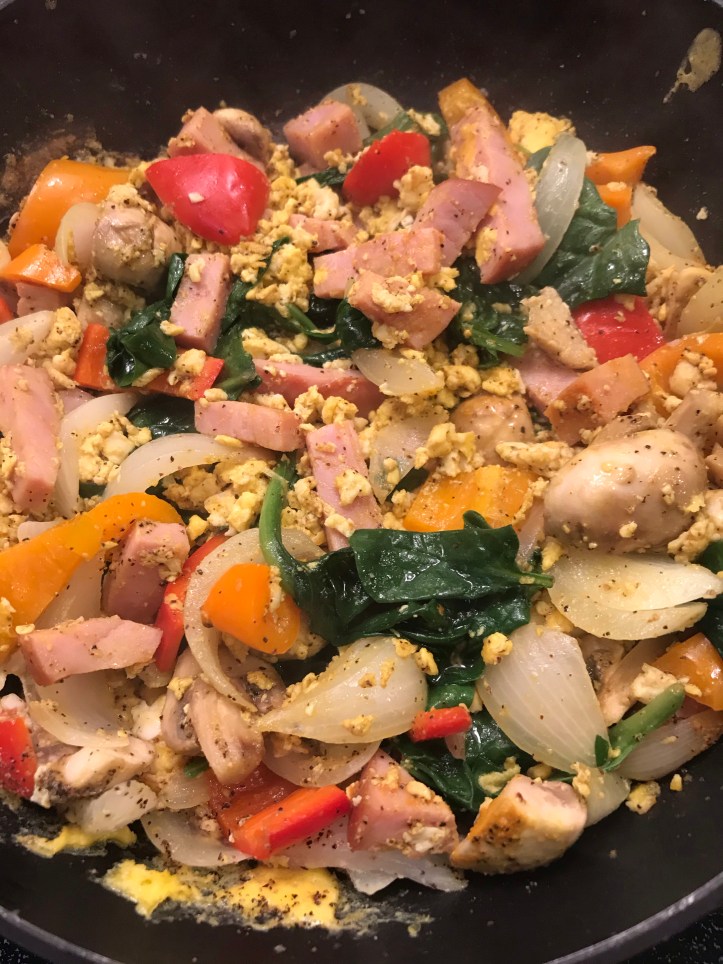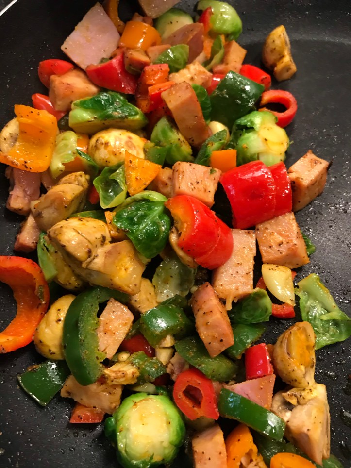 Stir-fry mushroom, red pepper, yellow pepper, Russell sprouts and and add ham if you like, and stir-fry as usual with garlic and oil and toward the end add some turmeric, pepper and salt. You can eat this with porridge or cooked rice.