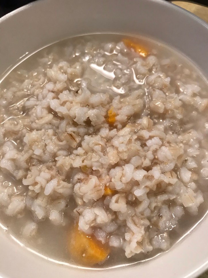 Chinese people often eat rice porridge with egg dish and vegetables dishes for their breakfast. Add some sweet potato cubes and rice together with water and boil and then simmer for about 30 min. Make sure to put enough water to cook a pot of the rice porridge. You can use white rice or brown rice. I like to use brown rice because it is healthier.