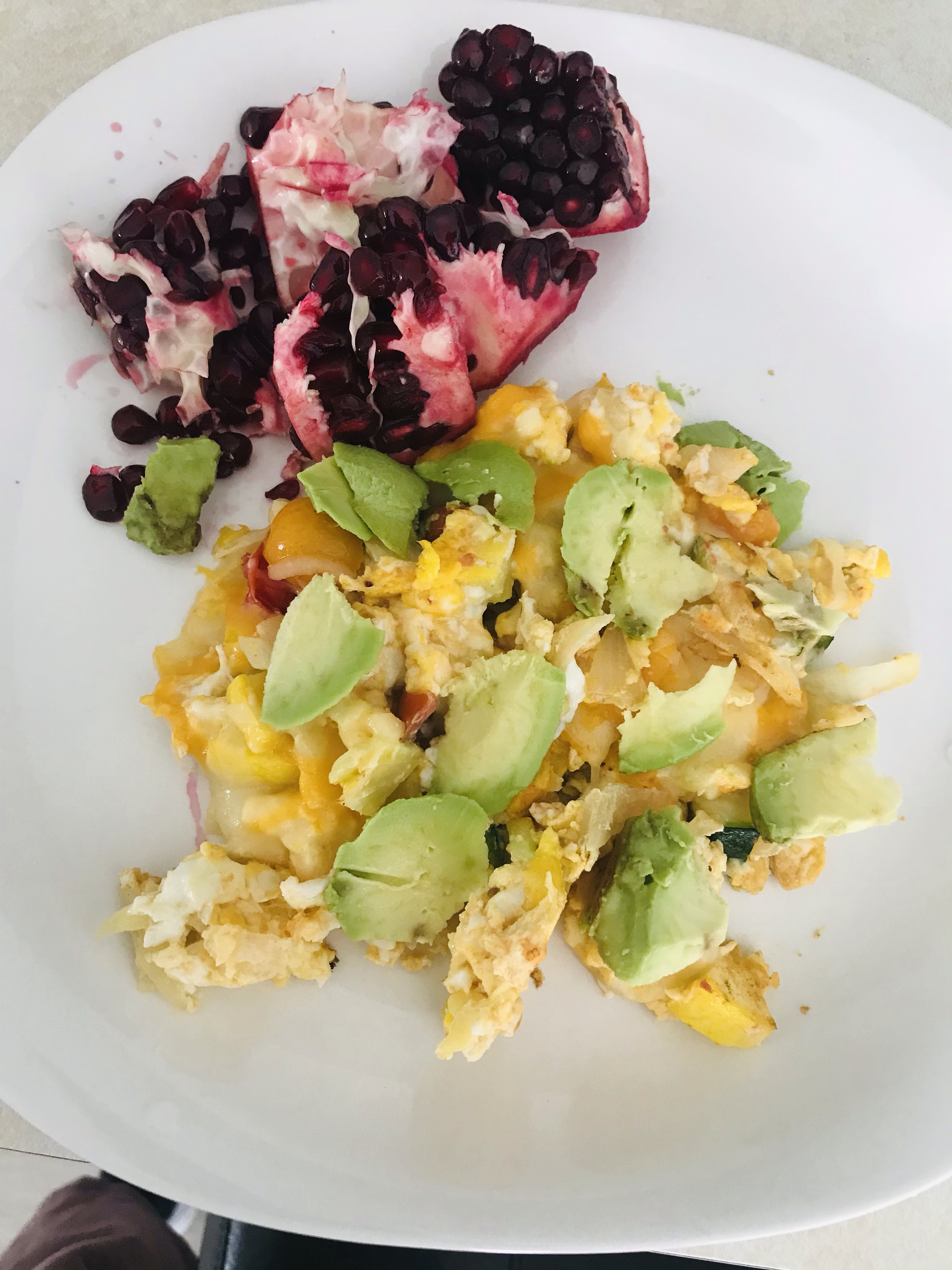 Stir-fry all the veggies and when it is half way done, crack the eggs and put in the eggs and stir them in the pan until all done cooking. Add shredded cheese on top and sliced or diced avocado on the top.