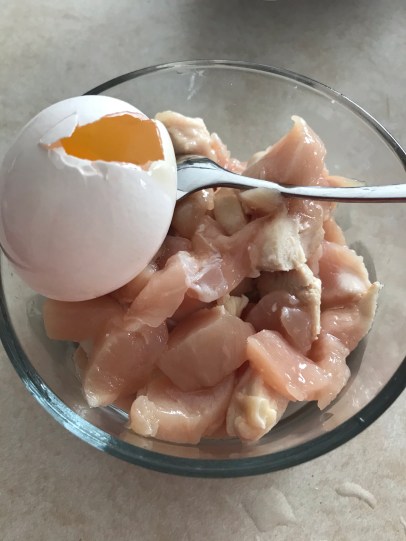 Add the egg white, a little bit of corn starch, sesame oil, and salt and pepper to marinade the diced chicken).