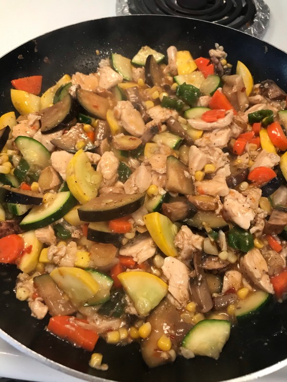 Then in the nonstick pan, add the chicken and in another pan add the veggies (harder veggies go in first). Stir fry them in separate pans. You can add a bit of soy sauce into the stir-fried chicken. When chicken is done on both sides, then add the cooked veggies into the chicken and continue to stir fry a bit.
