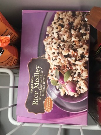 - Frozen grains: cooked brown rice, mixture of grains and beans, etc. (You can buy them from Trader Joe or you can make them yourself and freeze them in sandwich bags)
