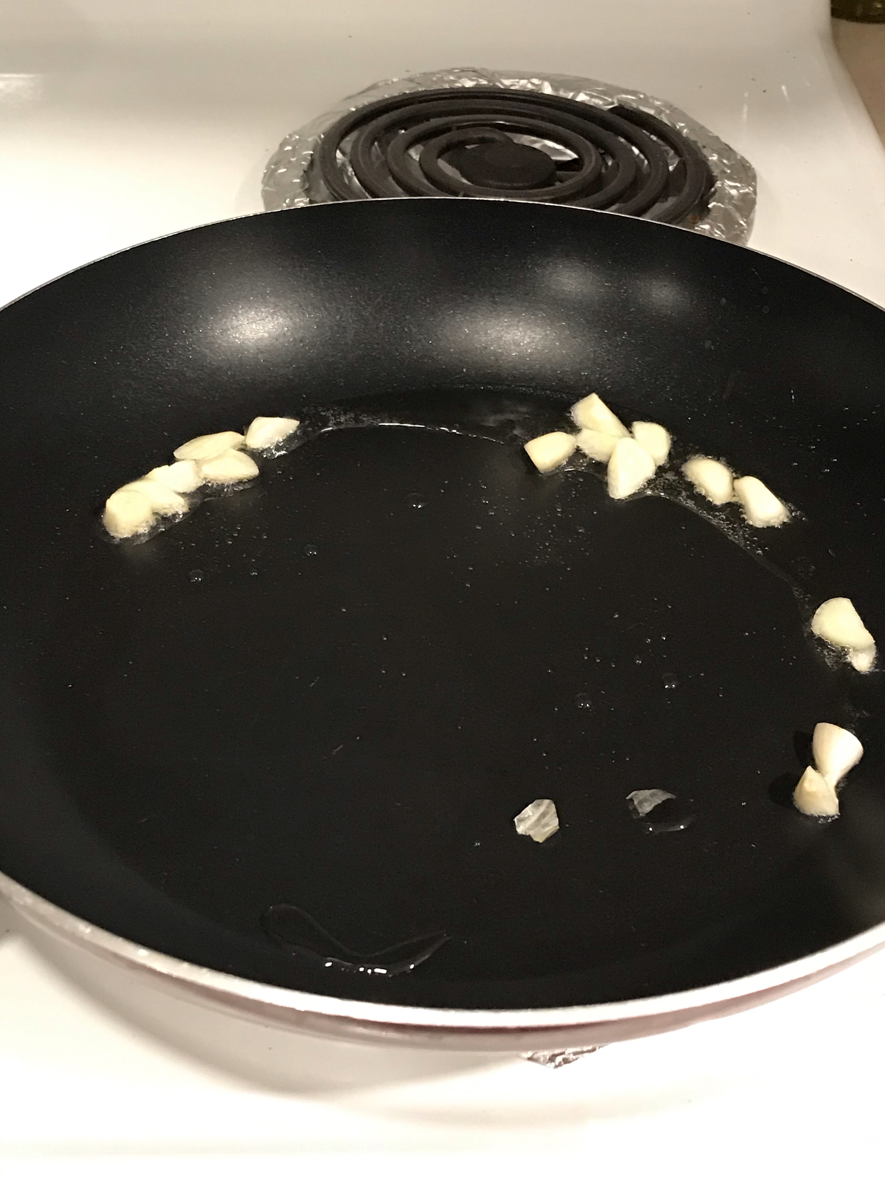 - Add chopped garlic into the oil.