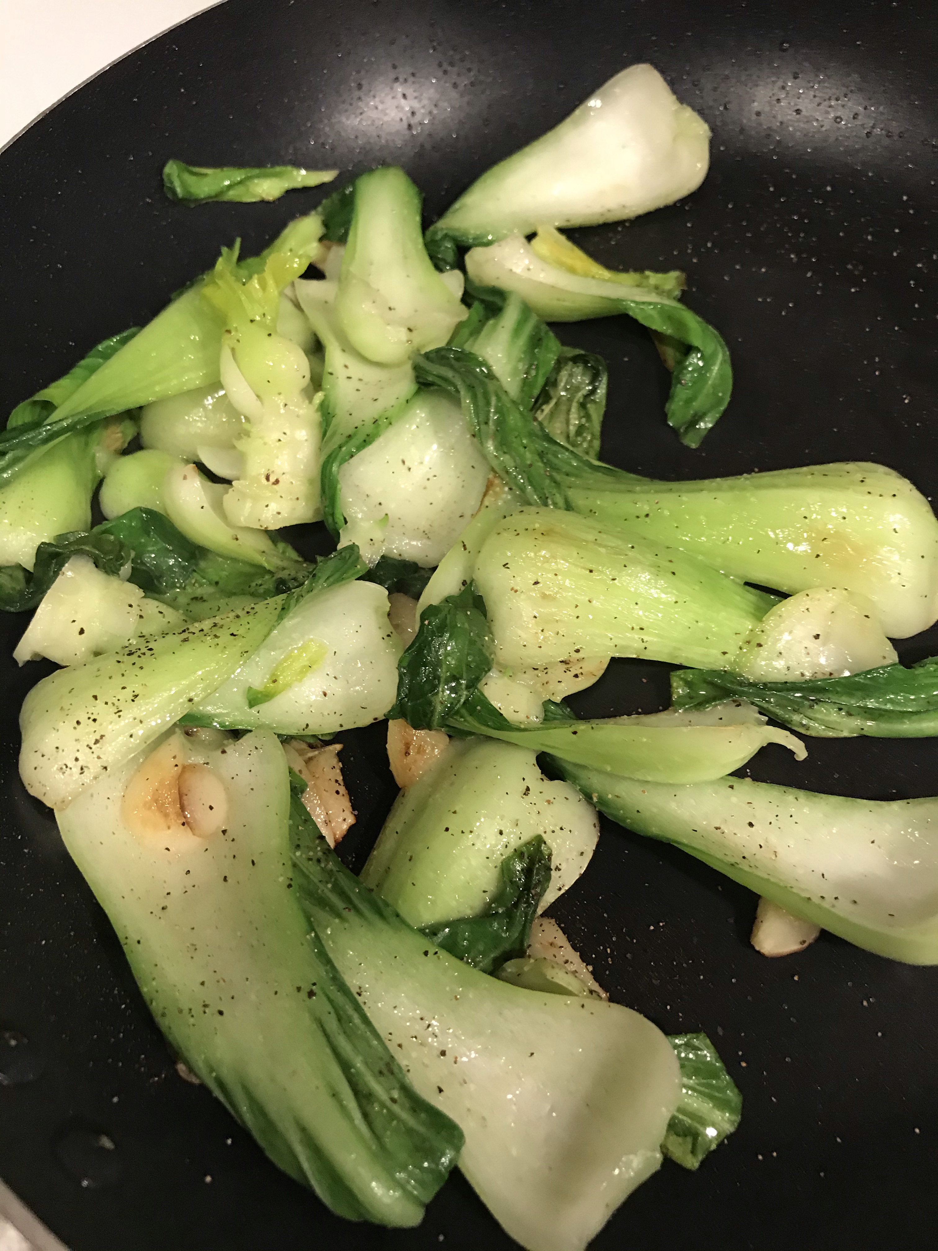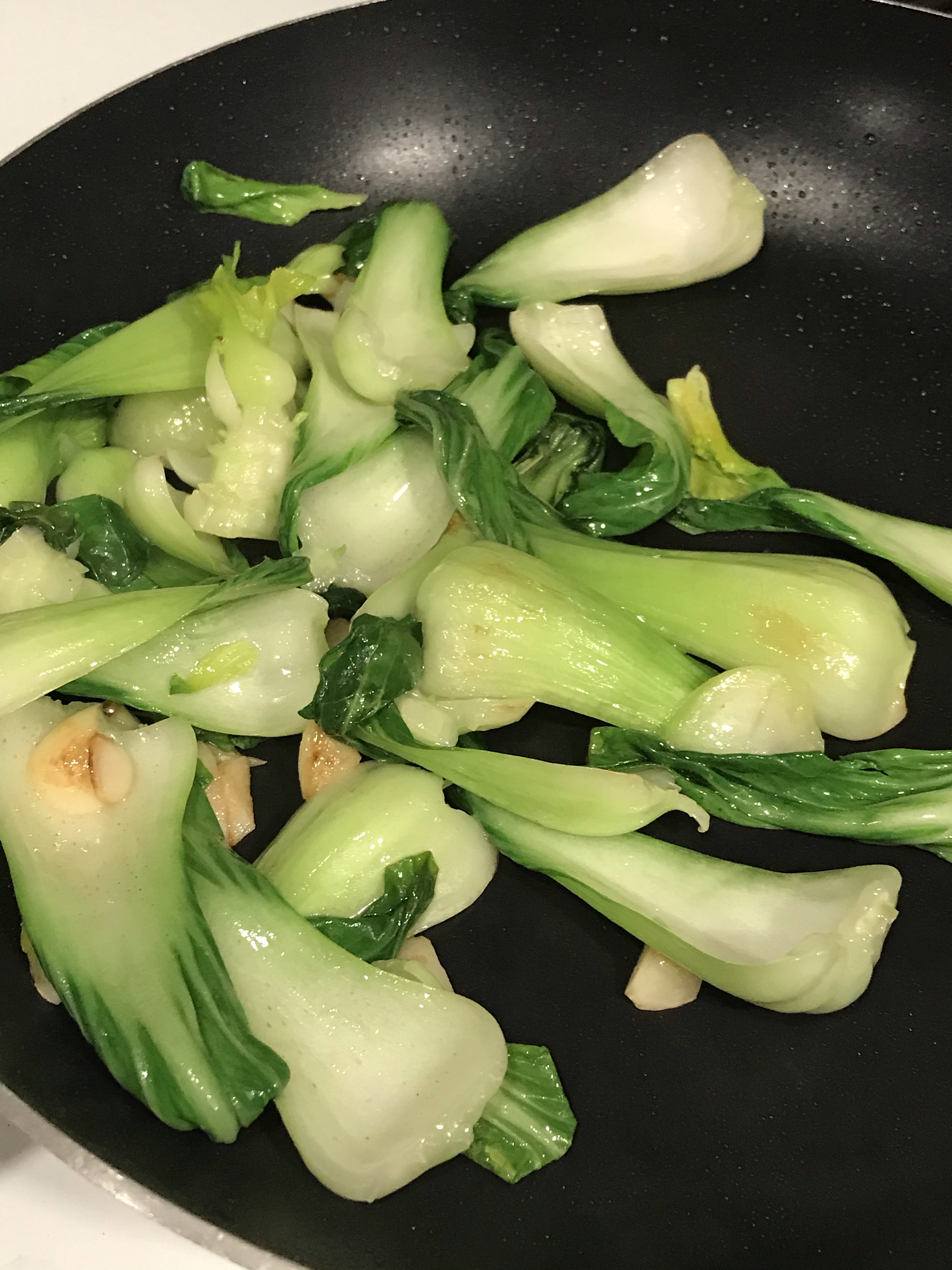 - After 30 seconds add them Bok Choy and stir fry them until they look like the Bok Choy you see in the photos below.
