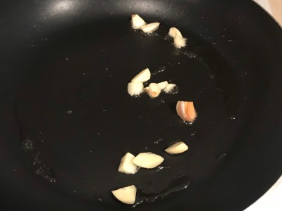 First, heat up some oil over medium high heat and add chopped garlic and ginger. Stir it for 30 seconds.