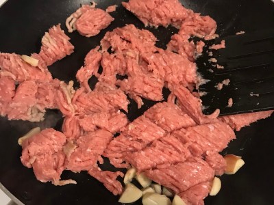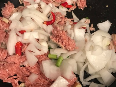 - Always cook the meat and vegetables on separate pans over medium-high heat. That way you can make sure meat is cooked through and have a better control on not overcooking vegetables. Heat oil and once it is hot, put in the garlic and ginger (Here I forgot to put ginger until after I put the ground meat). Stir-fry the ground meat a bit, then add onion and chili (if you like) and stir-fry until it is all cooked.