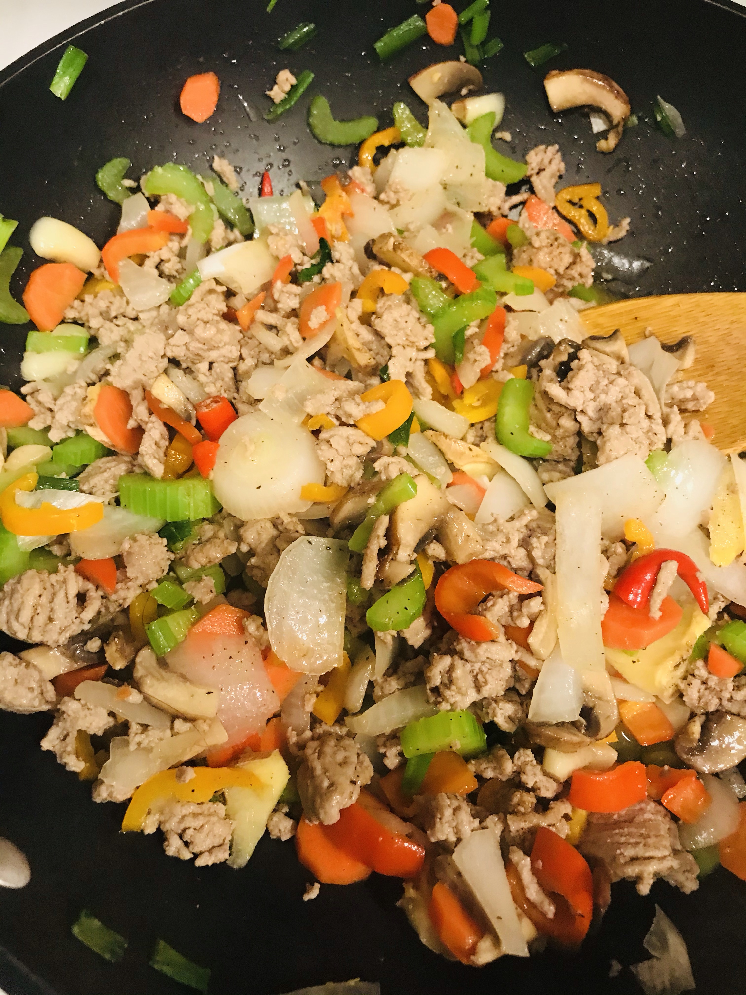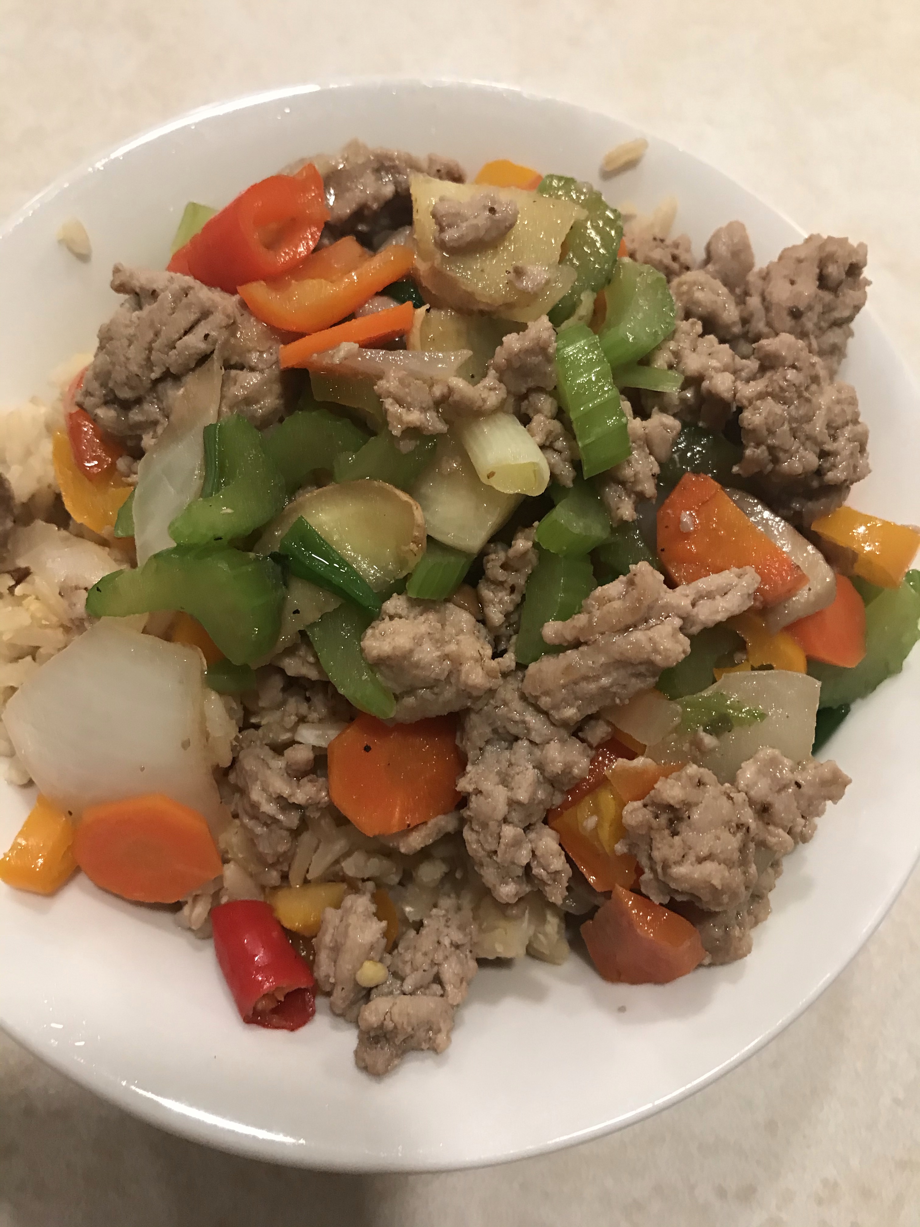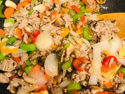 A quick stir-fried dish with cut veggies and ground meat (no meat cutting is required for this meal, yeah!)