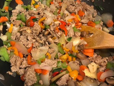 3. Mix well the cooked meat with cooked veggies together and then turn off the heat.
