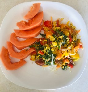 Scrambled eggs with a lot of veggies is a great way to come up with a healthy breakfast. It takes as much time as making a French toast except that it is a lot healthier.