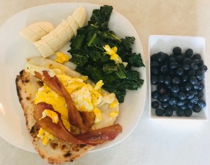 All you have to do is stir fry your veggies with cut garlic as a side dish. And I heat up the bacon on the stove and panfry or stir fry the eggs. And add the cooked eggs and heated bacon on top of nan bread (heat up nan bread in the oven for 10 min beforehand as instructed in the package). Serve all these with your favorite fruits.