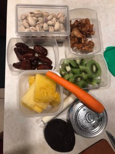 I pack all the dry food in the cooler and leave the cooler on my kitchen counter the night before. And the next day I take all the perishable, which I prepared the night before, out of the refrigerator and pack them into the cooler with two fake ice packs the next day.