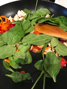 Just heat up at least one spoon of oil. After it is heated, toss in chopped garlic, a few seconds later, toss in the cut vegetables. Sprinkle a bit of pepper and salt on cooked veggies.