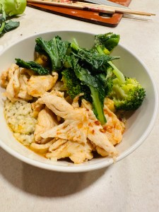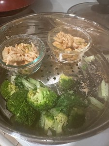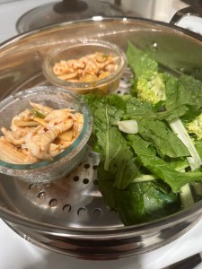 Since cooking or heating up food with high heat is not the healthiest way to prepare for food and can produce Advanced glycation end products (AGEs) that cause aging process in our body inside and out, today I used “steaming” to heat up leftover chicken. I also steamed fresh vegetables.
