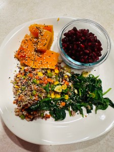 This meal only took me 15 min. I steamed cut squashes for about 8 to 10 minutes and on a pan I stir fried the spinach and heated up the frozen whole grain medley I got from the Trader Joe.