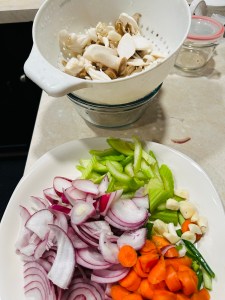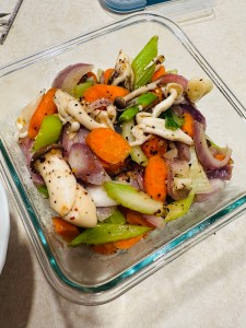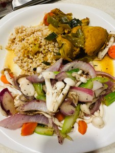 Heat up about 2 tablespoons of avocado oil or coconut oil. Stir-fry carrots, onion, celeries, green onion, chopped garlic and green onion. At the end of stir frying, add spices—salt, pepper, chili pepper, garlic powder, Tumeric powder (optional). Don’t overcook to preserve the nutrients. I like the dish when the vegetables are slightly crunchy. Eat it with brown rice and a meat dish or some nuts if you are a vegetarian.