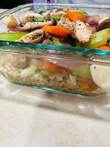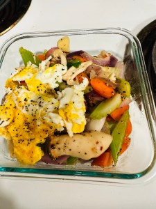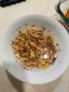 I ate this vegetable dish with a stewed Chicken dish I have cooked the other day. If you don’t have any meats or don’t feel like cooking any meat, you can also easily get a roasted chicken from the store. Cut up the roasted chicken and stir fry the chicken pieces with garlic, green onion. Stir-frying the chicken with garlic and a bit of oil will make the chicken taste better. You can eat it with stir-fried vegetables and make a very balanced meal for yourself!! I have enough leftover for lunch next day!!! Yeah!!! I cooked an egg to add it to the leftover veggies for tomorrow Lunch.Shell about five walnuts and soak them overnight. It will still taste crunchy and tasty! You can find videos on line to learn how to crack them open easily. Crack and shell about five walnuts. Soak the walnuts in drinkable water overnight. Tomorrow I will drain the water and add it to my lunch box. This will add more protein to my lunch. I will eat the leftover veggies, egg, and walnuts over brown rice tomorrow.