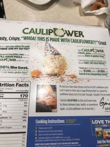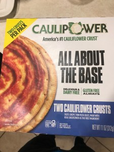 I divided the cauliflower pizza crust into four smaller pieces(I got this from a regular grocery store). I used two of these pieces to make two little pizzas for my dinner. I just first put a layer of tomato paste, then on top I added spinach, chicken and covered it with slices of cheese. I baked a quarter piece of a medium size pizza crust on my little pizza machine for about 5 min. You can also add other veggies like yellow and red pepper, and mushroom. The cauliflower pizza tastes just like a regular pizza. It is great for people who want to avoid eating wheat products and simple carbohydrates. However, the following cauliflower pizza crust does contain some brown rice flour. It also contains yeast for leavening as well. A box contains two medium-sized pizzas.