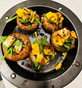 Ingredients: washed mushrooms, baby Spinach, cheese and Italian salad dressing. Procedure: stuff the baby spinach and cheese into the mushrooms. And drizzle Italian dressing over the stuffed mushrooms. Bake them over 350 degrees for about 10 to 15 min until it looked cooked as below.Sprinkled stuffed mushrooms with microgreen and add some cut cherry tomatoes to the plate.