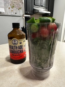 The next day add the kombucha tea into the blender. Use only 4 Oz to 5 Oz of kombucha (or other liquid such as coconut water) for 16 Oz blender and add the chia seeds if you like. Blend it well and then
