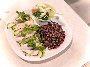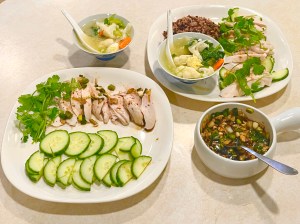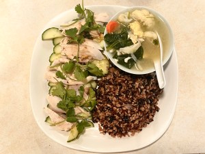Serve this chicken and Hainan rice with uncooked cucumber slices and some cilantro and the above homemade sauce!