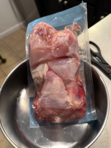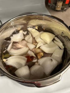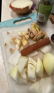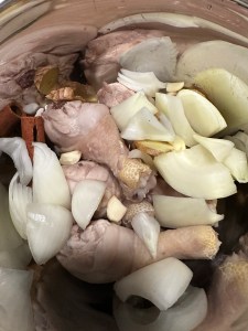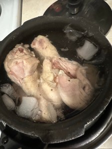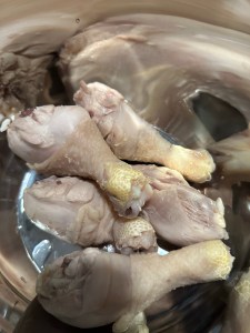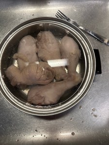 Four or five chicken drumsticks. I got organic three-bags pack in the Costco. I use one of them and keep the other two in the freezer for later usage.Add enough water to submerge these chicken drumsticks in a pot. Boil the water and as soon as it is cooked through (no blood inside), toss the boiled water. Rinse the foam off the drumsticks. (Alternative method to cook a clear chicken broth: before boiling them, rub the chicken drumsticks or whole chicken with a lot of salt and exfoliate all the unclean surface and rinse them off very well. Then you can skip the above step, just directly make the chicken stock. Just after boiling and then simmer for about 20 min skim off a bit of foams. Then continue to cook for 25 min more. The broth would be just as good!)I put these cooked and clean drumsticks to another clean bigger pot. Prepare one onion, one cinnamon stick, slices of ginger, and four to five cloves of garlic , two to three stalks of green onions, 8 small whole black peppers into the pot (or add the ground black peppers later into the broth). I wish I have green onions. Add the seasonings into the pot. Add water into the pot and bring it to a boil and then turn to low heat 1–one notch higher than low. Simmer at least 45 min or 2 hrs. But if you want to eat the chicken like in the Hainan chicken, keep the stock but take the chicken drumsticks out after cooking for 45 min. Put the chicken in a container of water with some ice cubes and soak them about 10 to 15 min. Then you can use the chicken meat in Hainan chicken rice or in noodle soups or even salad.Soak the chicken in a container of water with some ice cubes to stop the cooking process for 10 min for drumsticks, but 15 min for a whole chicken.