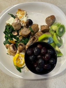 Very simple: Place and heat oil in the pan. Pan-fry one egg and sausage (one each per person) on both sides, and on the other side, put a few cloves of garlics (chopped) and then stir fry the mushrooms and spinaches with garlic. No salt required since sausage is already salty. Serve them with some fruits! Yummy!I like these sausages I got from Costco. They are nitrate free and use organic chicken!