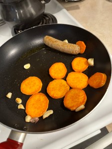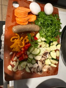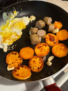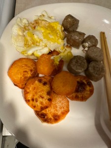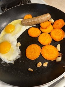 Eggs, organic nitrate -free chicken sausage, sweet potatoes with veggies