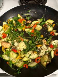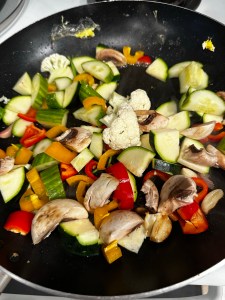 Ingredients: two eggs, half sweet potatoes, 1/4 zucchini, some cucumbers, some cauliflower, one yellow and red peppers, 3 to 4 cloves of garlic, and cilantro. Hear 1 or 2 tablespoons of cooking oil on the pan. Place the sweet potato slices, and sausage on the pan. Add garlic. Flip sausages and sweet potatoes to the other side after they are slightly brown. Add eggs on one side. Turn the eggs to the other side, turn the sweet potato and sausage to the other side. Add shredded cheese on eggs if you like.Take them out when cooked. Add oil to the pan. When heated, add chopped garlic. Stir fry the veggiesAdd cut-up cilantro into the pan one minute before the dish is done. Add your seasonings. I added Italian seasonings, orégano, chili pepper, salt and pepper. The vegetables taste better when they are fresh, not frozen and when not over cooked. This vegetable dish should not be cooked over 4 min.