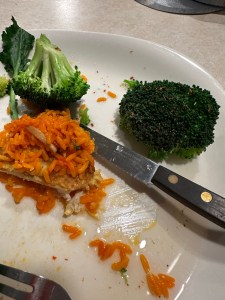 It is handy to have a bag of prewashed broccoli in the fridge. All you have to do is to toss them directly into a small pot or pan and add 1/2 cup of water and steam for a couple of minutes after the water is steaming if you don’t have a steamer device. Don’t over steam it. It tastes really good when it is crunchy and less steam time will help retain the nutritional value of the vegetables too. Just add some salt and pepper on your steamed veggies before serving.